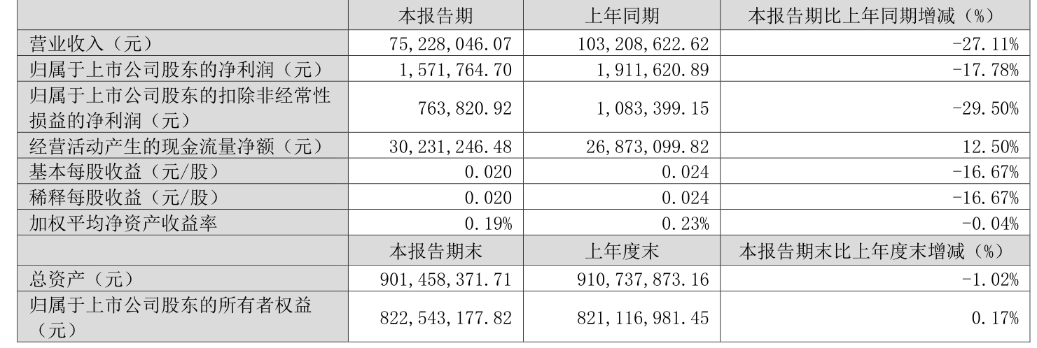 中证智能财讯凯淳股份(301001)4月22日披露2025年第一季度报告。公司实现营业总收入7522.8万元,同比下降27.11%;归母净利润157.18万元,同比下降17.78%;扣非净利润76.38万元,同比下降29.50%;经营活动产生的现金流量净额为3023.12万元,同比增长12.50%;报告期内,凯淳股份基本每股收益为0.02元,加权平均净资产收益率为0.19%。