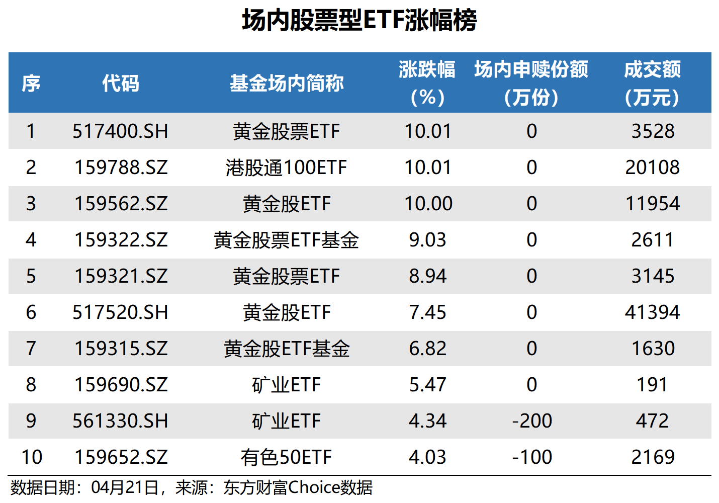 数据显示,昨日场内股票型ETF中,黄金股票ETF、港股通100ETF、黄金股ETF涨幅居前。其中,黄金股票ETF涨幅最大,达10.01%。