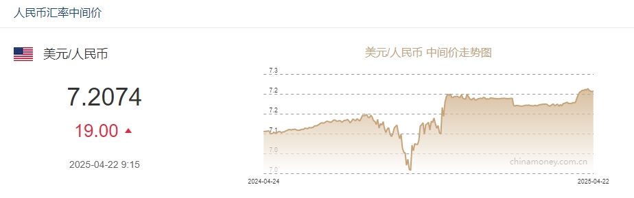 中新网4月22日电 据中国外汇交易中心网站消息,中国人民银行授权中国外汇交易中心公布,2025年4月22日银行间外汇市场人民币汇率中间价为:1美元对人民币7.2074元,下调19个基点。