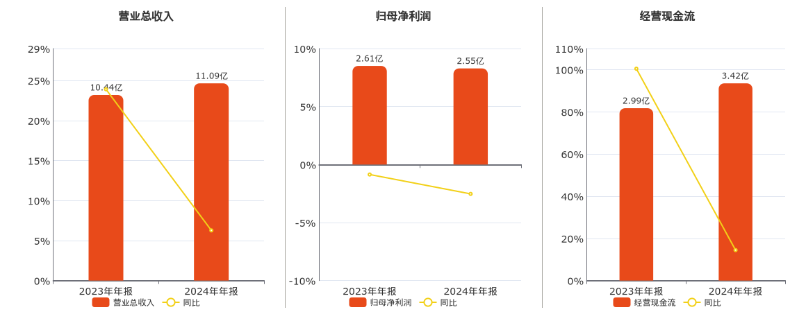 公司营业总收入为11.09亿元。归母净利润为2.55亿元,较去年同报告期归母净利润减少662.10万元,同比较去年同期下降2.53%。经营活动现金净流入为3.42亿元。