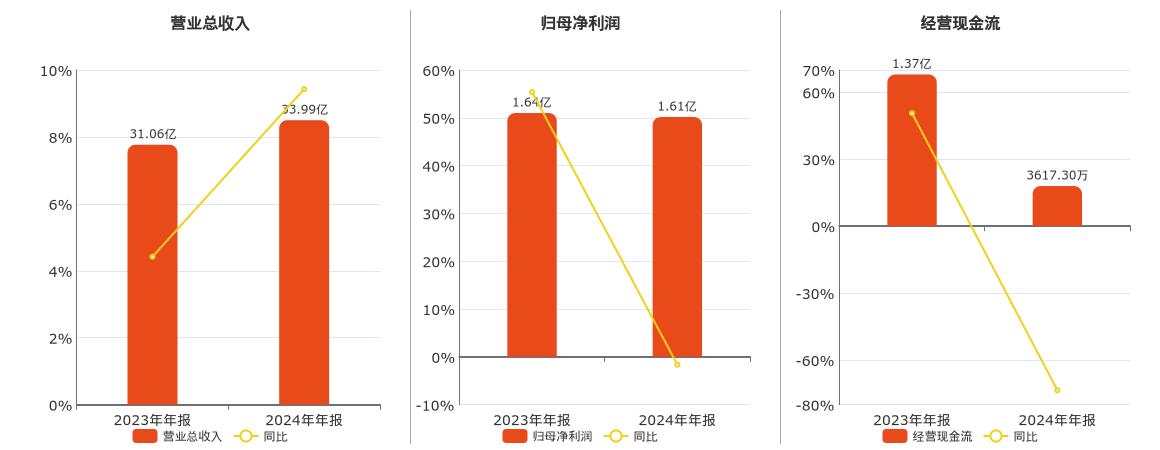 公司营业总收入为33.99亿元。归母净利润为1.61亿元,较去年同报告期归母净利润减少268.68万元,同比较去年同期下降1.64%。经营活动现金净流入为3617.30万元,较去年同报告期经营活动现金净流入减少1.01亿元,同比较去年同期下降73.55%。