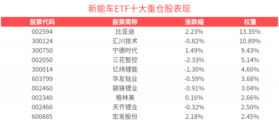 数据显示,截至2025年3月31日,中证新能源汽车产业指数(930997)前十大权重股分别为比亚迪(002594)、汇川技术(300124)、宁德时代(300750)、三花智控(002050)、亿纬锂能(300014)、华友钴业(603799)、赣锋锂业(002460)、格林美(002340)、天齐锂业(002466)、宏发股份(600885),前十大权重股合计占比57.98%。