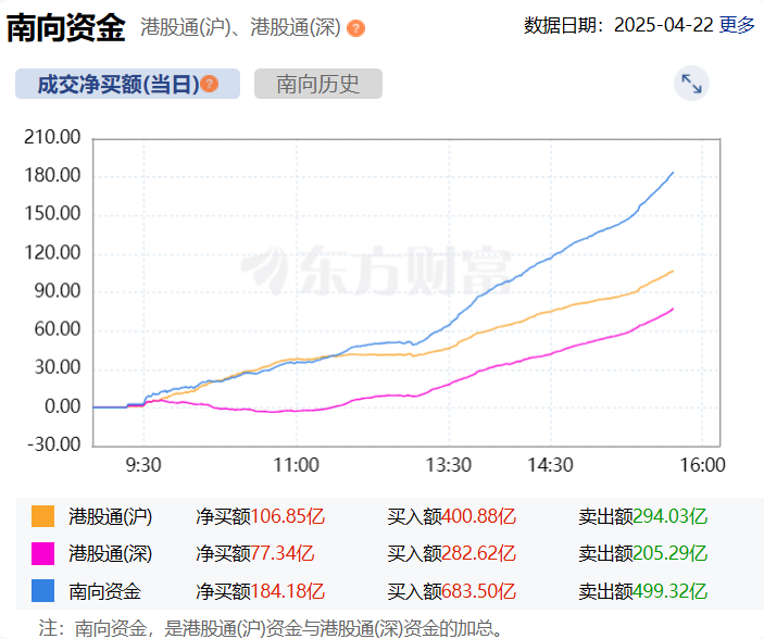 截至发稿,南向资金净买入超180亿港元。