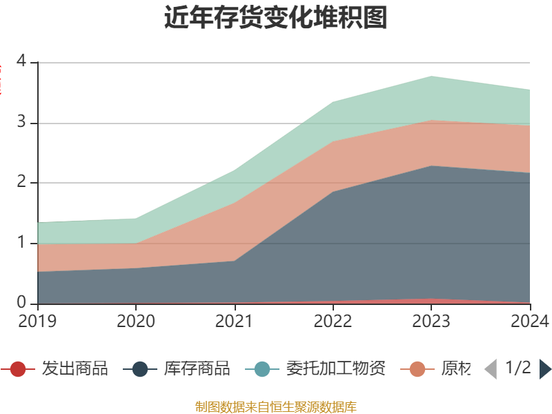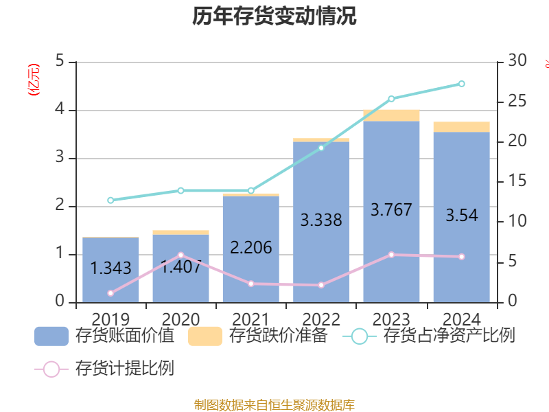 从存货变动来看,截至2024年末,公司存货账面价值为3.54亿元,占净资产的27.26%,较上年末减少2268.01万元。其中,存货跌价准备为2128.53万元,计提比例为5.67%。
