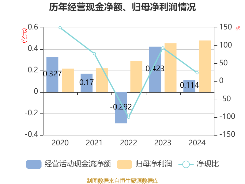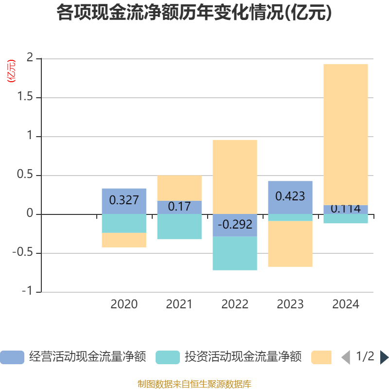 截至2024年,公司经营活动现金流净额为1139.22万元,同比下降73.08%;筹资活动现金流净额1.81亿元,同比增加2.4亿元;投资活动现金流净额-1203.9万元,上年同期为-922.9万元。