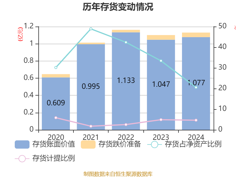从存货变动来看,截至2024年末,公司存货账面价值为1.08亿元,占净资产的20.53%,较上年末增加299.65万元。其中,存货跌价准备为526.77万元,计提比例为4.66%。