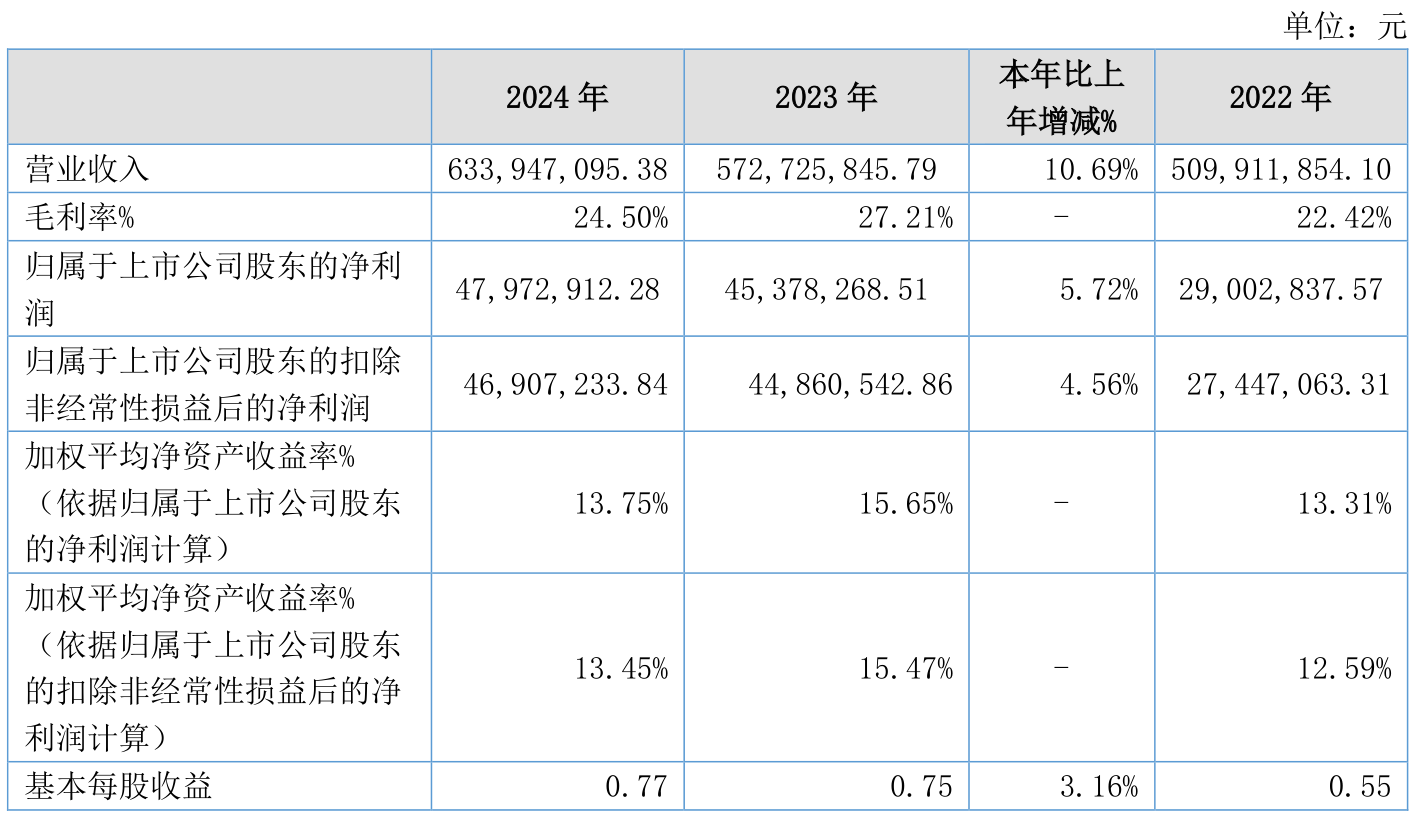 2024年全年,公司研发投入金额为2647.81万元,同比增长4.48%;研发投入占营业收入比例为4.18%,相比上年同期下降0.25个百分点。此外,公司全年研发投入资本化率为0%。