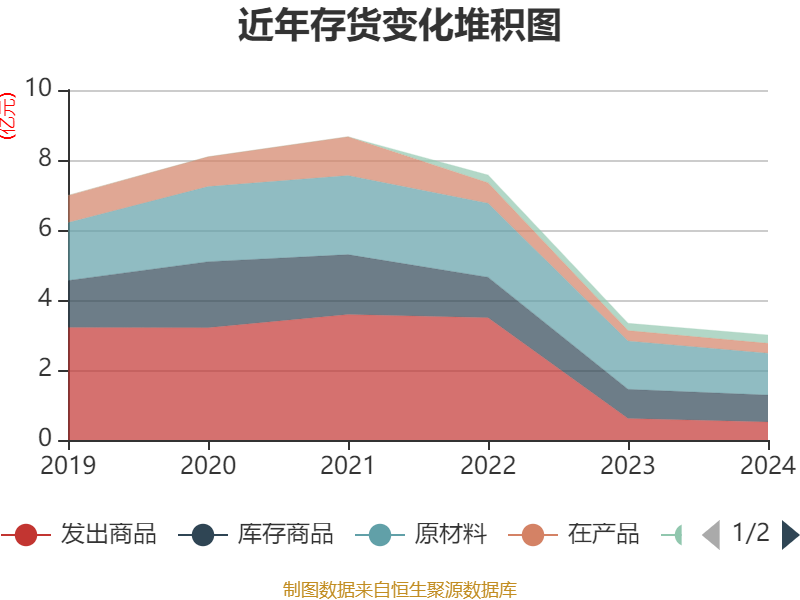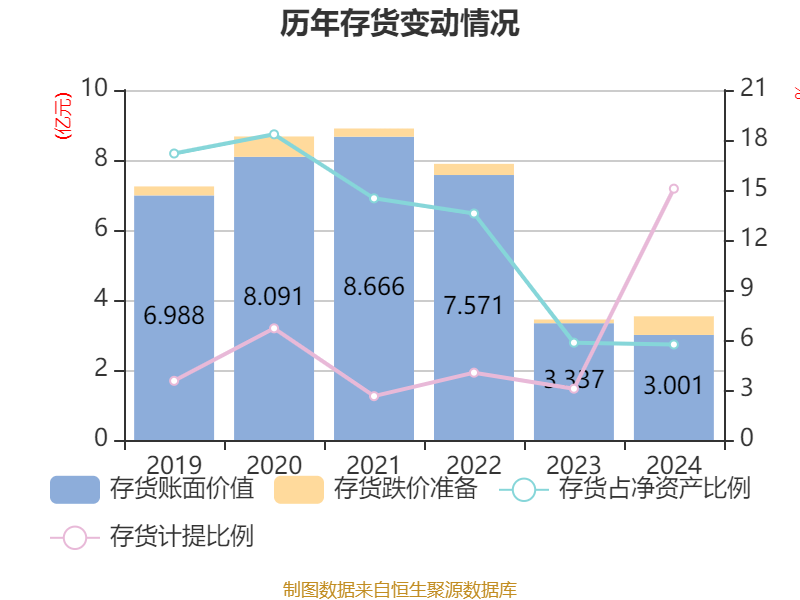从存货变动来看,截至2024年末,公司存货账面价值为3亿元,占净资产的5.73%,较上年末减少3358.09万元。其中,存货跌价准备为5328.89万元,计提比例为15.08%。