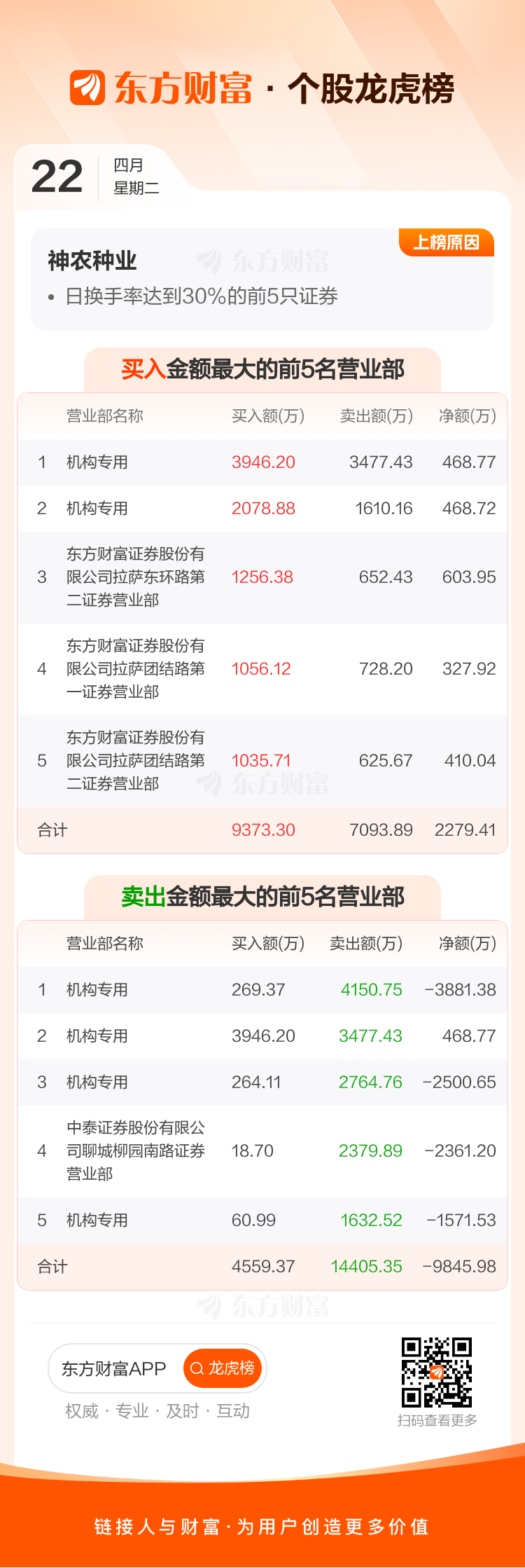 交易所2025年4月22日公布的交易公开信息显示,神农种业因成为日换手率达到30%的前5只证券上榜。神农种业当日收报4.57元,涨跌幅7.53%,偏离值30.86%,换手率30.86%,成交额11.99亿。