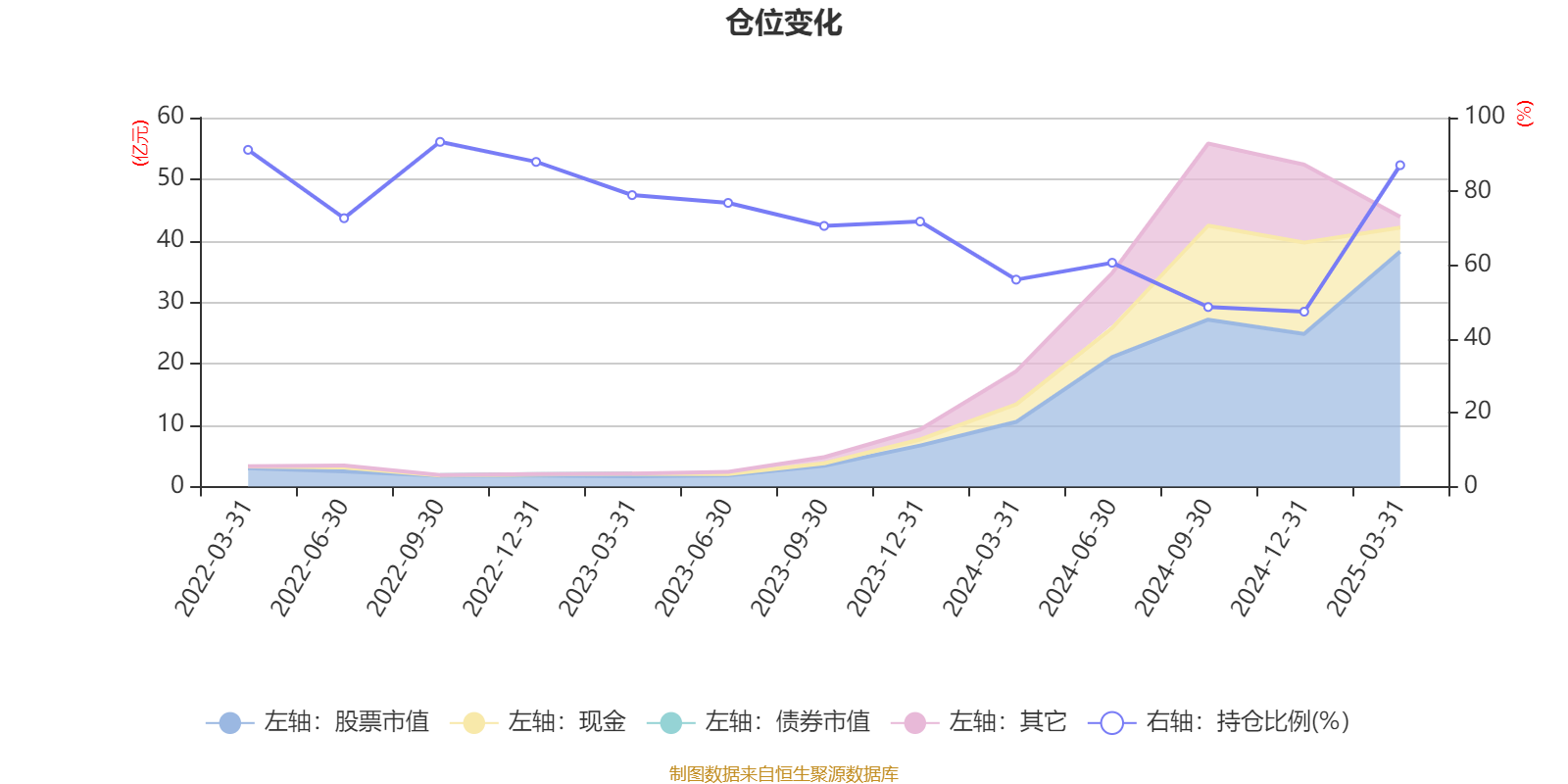 据定期报告数据统计,近三年平均股票仓位为71.03%,同类平均为87.38%。2022年三季度末基金达到93.42%的最高仓位,2024年末最低,为47.4%。