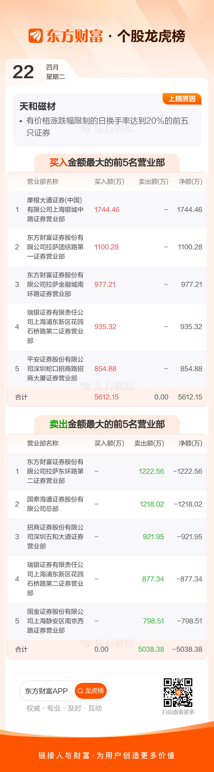 交易所2025年4月22日公布的交易公开信息显示,天和磁材因成为有价格涨跌幅限制的日换手率达到20%的前五只证券上榜。天和磁材当日收报50.12元,涨跌幅-8.66%,偏离值29.50%,换手率29.50%,成交额9.79亿。