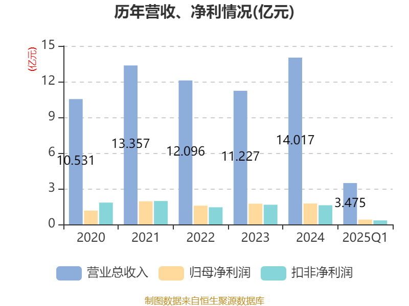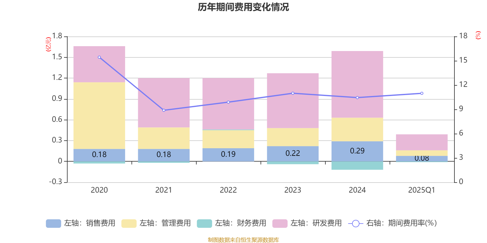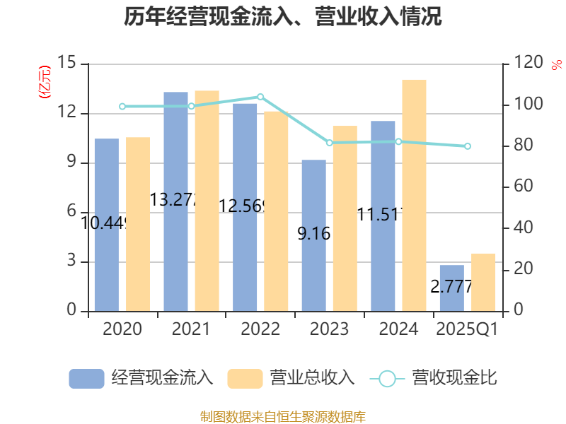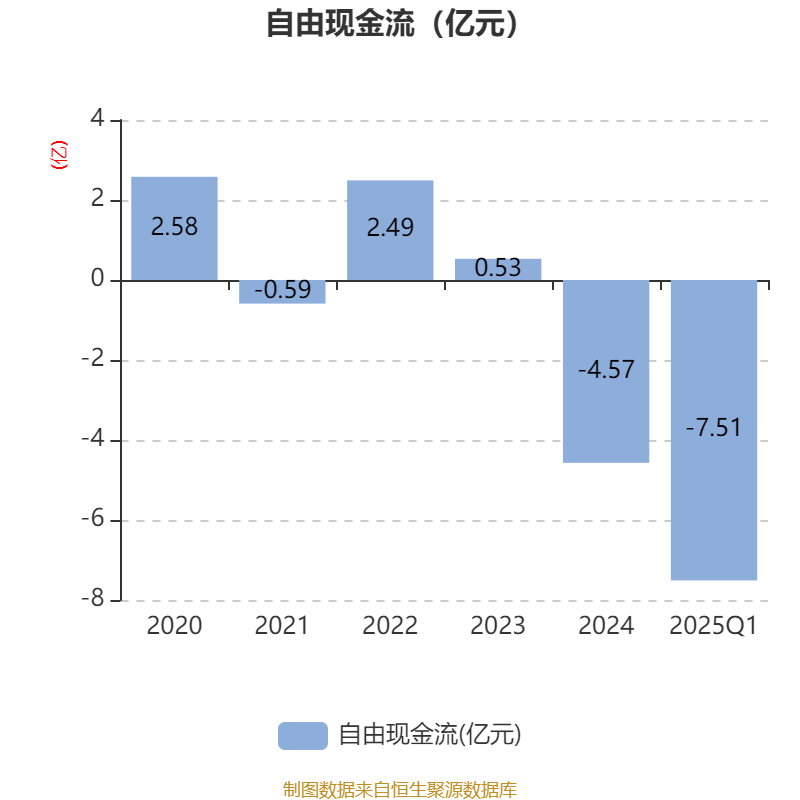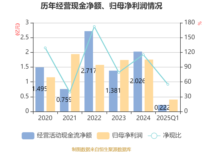 截至2025年一季度末,公司经营活动现金流净额为2220.34万元,同比下降8.11%;筹资活动现金流净额-42.86万元,同比增加26.57万元;投资活动现金流净额-7.52亿元,上年同期为-4.64亿元。