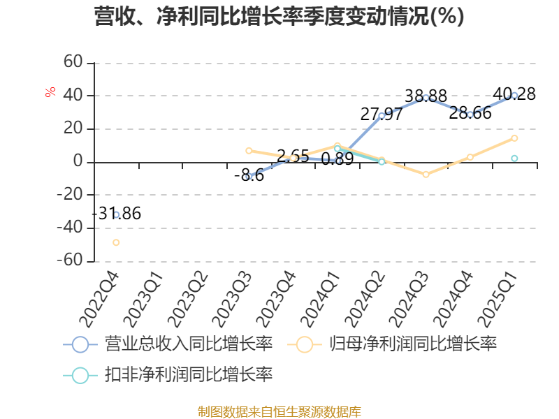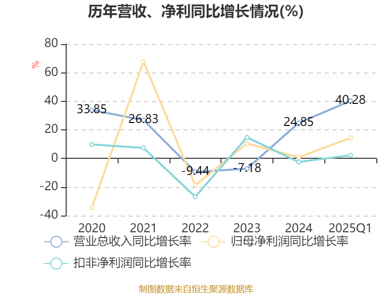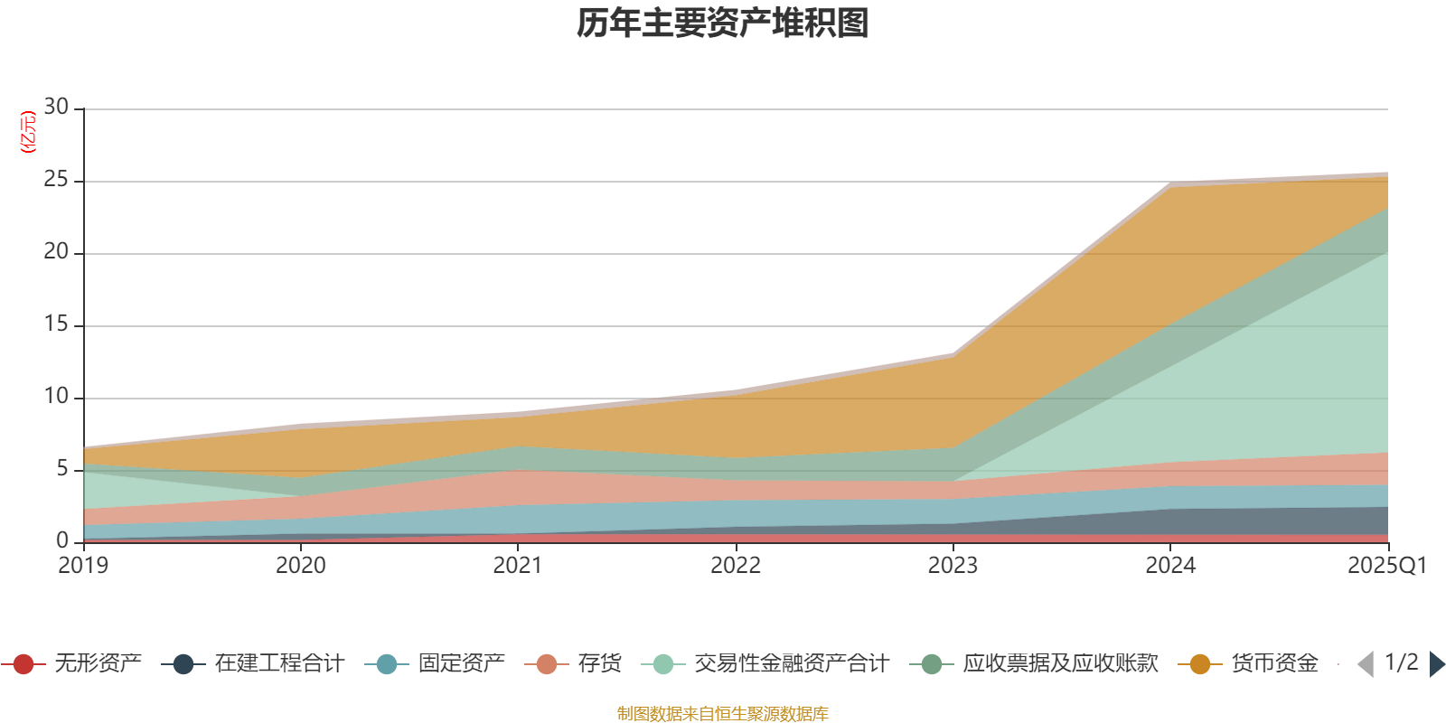 资产重大变化方面,截至2025年一季度末,公司货币资金较上年末减少77.18%,占公司总资产比重下降29.52个百分点;交易性金融资产合计较上年末增加110.1%,占公司总资产比重上升27.66个百分点;存货较上年末增加34.36%,占公司总资产比重上升2.05个百分点;在建工程合计较上年末增加7.46%,占公司总资产比重上升0.32个百分点。