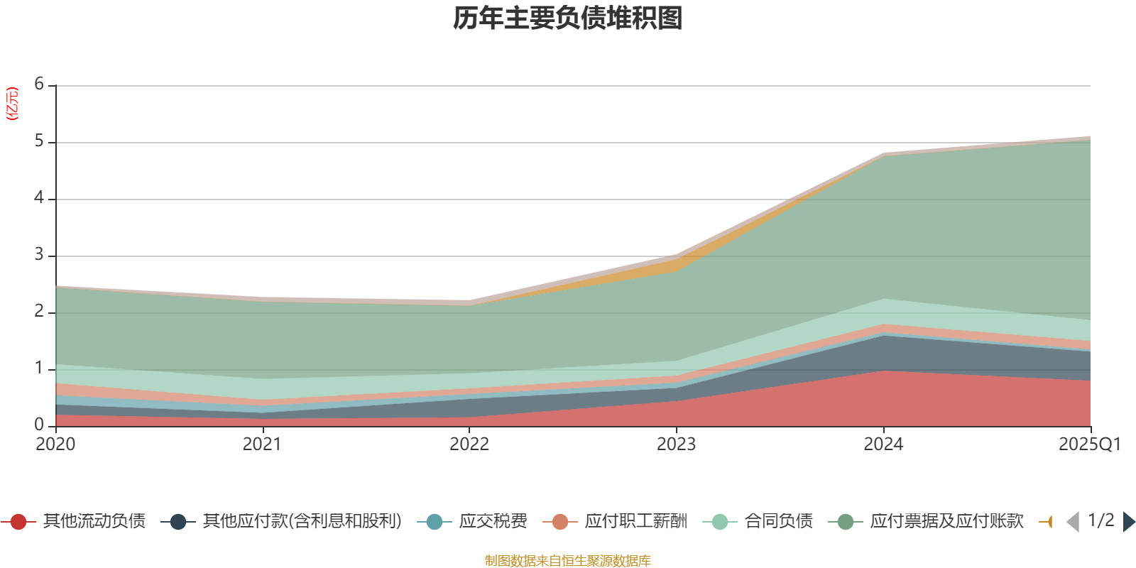 负债重大变化方面,截至2025年一季度末,公司应付票据及应付账款较上年末增加26.64%,占公司总资产比重上升2.33个百分点;其他流动负债较上年末减少17.98%,占公司总资产比重下降0.79个百分点;其他应付款(含利息和股利)较上年末减少17.36%,占公司总资产比重下降0.49个百分点;合同负债较上年末减少18.46%,占公司总资产比重下降0.37个百分点。