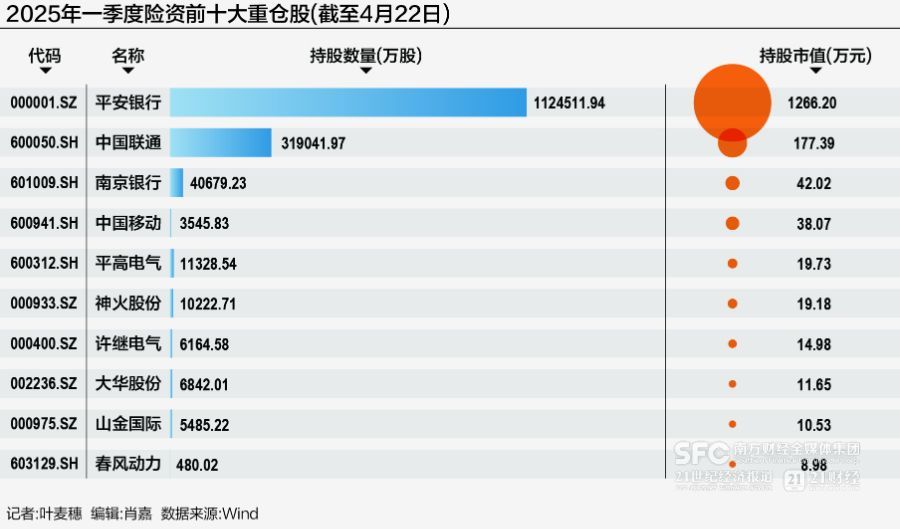 从险资的重仓股来看,银行股依然是险资的“心头好”。在险资最新持仓额前十的持股名单中,平安银行和南京银行占据了两个席位,险资分别持有112.45亿股、4.07亿股,持仓市值高达1266.2亿元、42.02亿元。