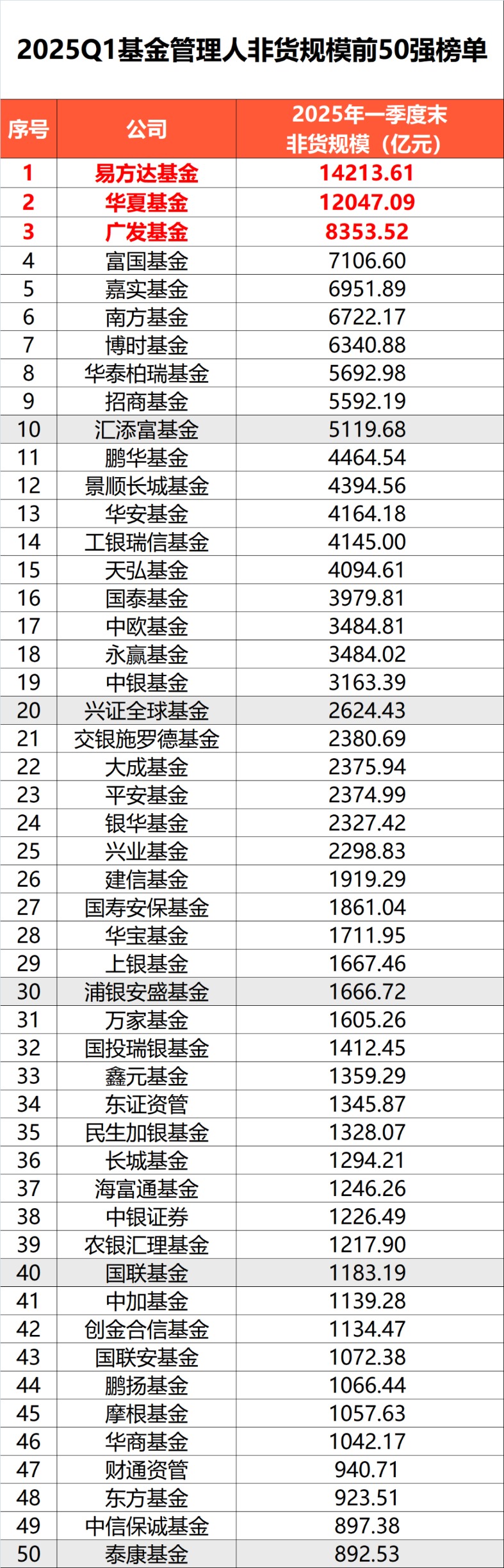 从非货币基金规模看,易方达基金非货币基金规模为1.42万亿元,位居全市场第一;华夏基金以1.2万亿元名列第二;广发基金以8354亿元位居第三;富国、嘉实、南方、博时基金均超过6000亿元,分列第四至第七;华泰柏瑞、招商、汇添富基金均超过5000亿元,跻身前十。
