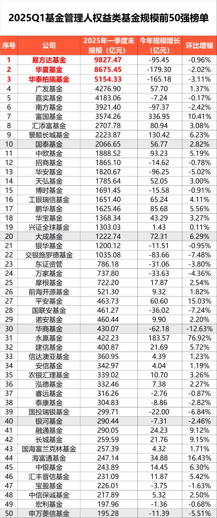 市场最关心的权益类基金(含QDII)方面,易方达、华夏、华泰柏瑞基金位居前三强。但在一季度股票ETF市场节节上涨的背景下,部分资金选择“落袋为安”,股票ETF市场头部基金公司总体规模出现萎缩。