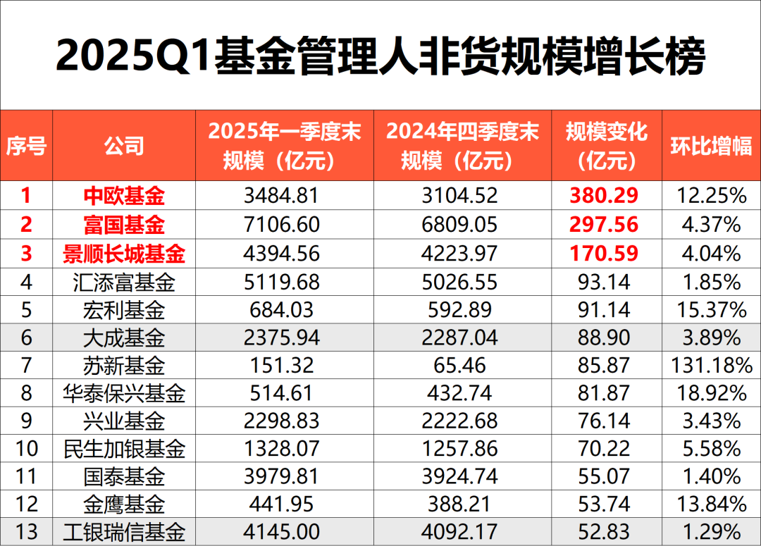 在一季度主动权益类基金规模跃升背景下,该类型基金规模和占比较大的基金公司,非货币基金规模迎来快速增长。其中,中欧基金一季度非货规模激增380亿元,增幅超12%,位居非货规模增长榜首;富国基金增长298亿元,位居第二;景顺长城基金增长171亿元,名列第三。