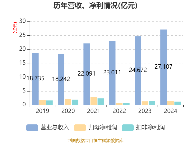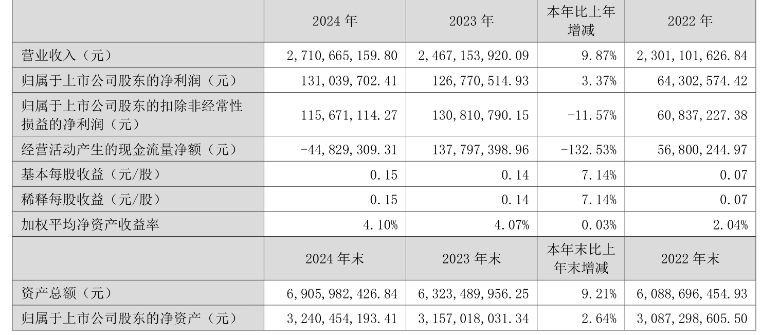 中证智能财讯隆华科技(300263)4月23日披露2024年年度报告。2024年,公司实现营业总收入27.11亿元,同比增长9.87%;归母净利润1.31亿元,同比增长3.37%;扣非净利润1.16亿元,同比下降11.57%;经营活动产生的现金流量净额为-4482.93万元,上年同期为1.38亿元;报告期内,隆华科技基本每股收益为0.15元,加权平均净资产收益率为4.10%。公司2024年度分配预案为:拟向全体股东每10股派现0.5元(含税)。