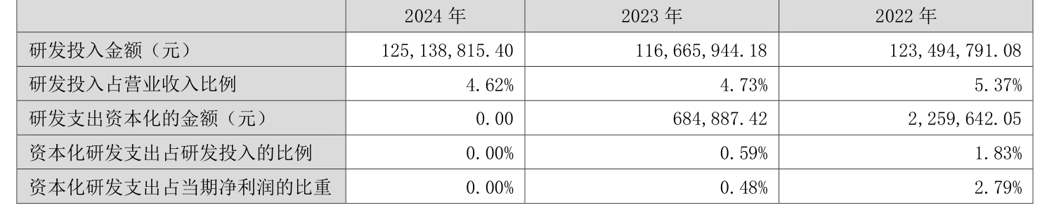 2024年全年,公司研发投入金额为1.25亿元,同比增长7.26%;研发投入占营业收入比例为4.62%,相比上年同期下降0.11个百分点。此外,公司全年研发投入资本化率为0%。