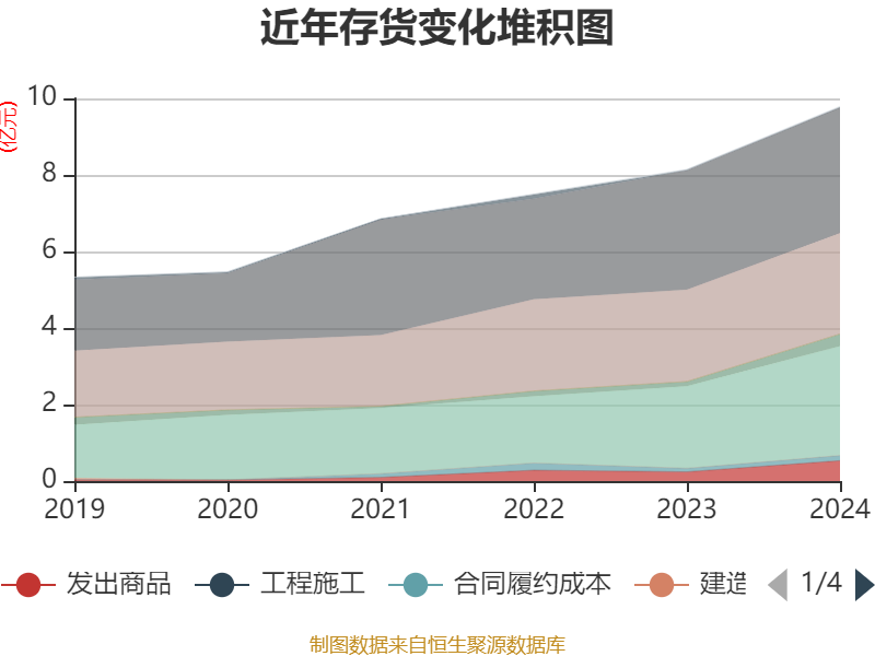 从存货变动来看,截至2024年末,公司存货账面价值为9.8亿元,占净资产的30.23%,较上年末增加1.64亿元。其中,存货跌价准备为1128.58万元,计提比例为1.14%。