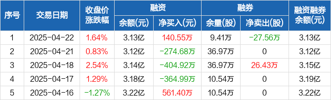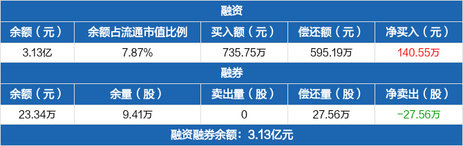 融资方面,当日融资买入735.75万元,融资偿还595.19万元,融资净买入140.55万元。融券方面,融券卖出0股,融券偿还27.56万股,融券余量9.41万股,融券余额23.34万元。融资融券余额合计3.13亿元。