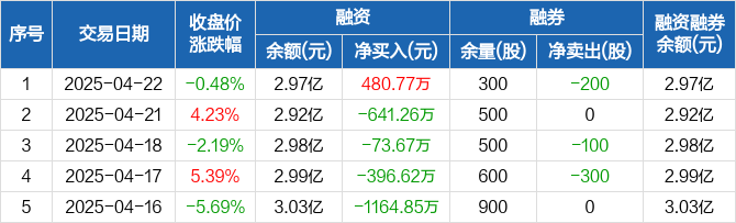 融资方面,当日融资买入2641.47万元,融资偿还2160.69万元,融资净买入480.77万元。融券方面,融券卖出0股,融券偿还200股,融券余量300股,融券余额2499元。融资融券余额合计2.97亿元。
