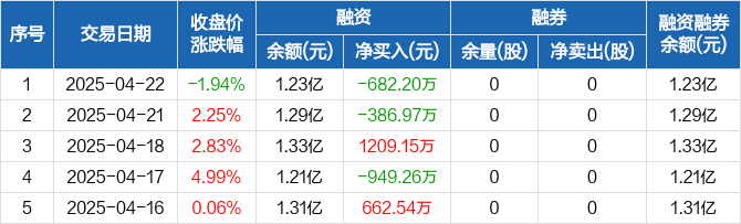 同益中融资融券信息显示,2025年4月22日融资净偿还682.2万元;融资余额1.23亿元,较前一日下降5.27%。