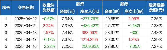 融资方面,当日融资买入2295.05万元,融资偿还2572.81万元,融资净偿还277.76万元。融券方面,融券卖出2.2万股,融券偿还1400股,融券余量29.85万股,融券余额176.12万元。融资融券余额合计7.36亿元。