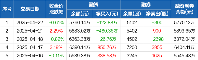 融资方面,当日融资买入361.15万元,融资偿还484.03万元,融资净偿还122.88万元,连续3日净偿还累计630万元。融券方面,融券卖出600股,融券偿还900股,融券余量5102股,融券余额9.98万元。融资融券余额合计5770.12万元。
