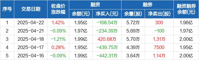 融资方面,当日融资买入741.9万元,融资偿还910.44万元,融资净偿还168.54万元。融券方面,融券卖出1600股,融券偿还1300股,融券余量5.72万股,融券余额61.38万元。融资融券余额合计1.96亿元。