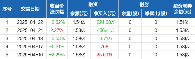 融资方面,当日融资买入200.68万元,融资偿还425.37万元,融资净偿还224.68万元,连续3日净偿还累计684.8万元。融券方面,融券卖出0股,融券偿还0股,融券余量0股,融券余额0元。融资融券余额合计1.51亿元。