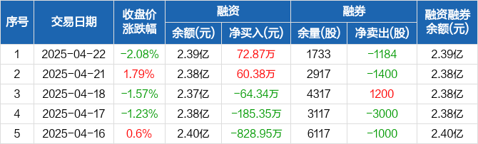 融资方面,当日融资买入386.52万元,融资偿还313.64万元,融资净买入72.87万元。融券方面,融券卖出0股,融券偿还1184股,融券余量1733股,融券余额7.92万元。融资融券余额合计2.39亿元。