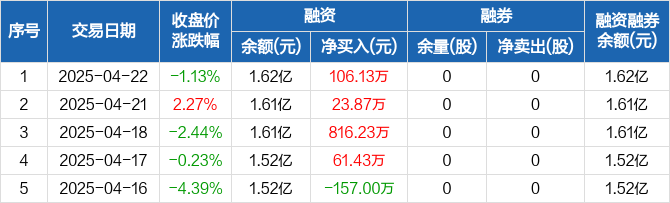 融资方面,当日融资买入603.14万元,融资偿还497.01万元,融资净买入106.13万元,连续4日净买入累计1007.66万元。融券方面,融券卖出0股,融券偿还0股,融券余量0股,融券余额0元。融资融券余额合计1.62亿元。