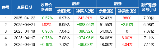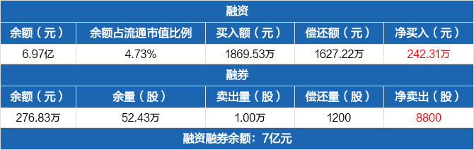融资方面,当日融资买入1869.53万元,融资偿还1627.22万元,融资净买入242.31万元。融券方面,融券卖出1万股,融券偿还1200股,融券余量52.43万股,融券余额276.83万元。融资融券余额合计7亿元。