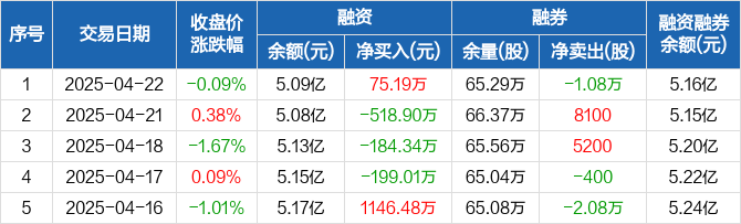 隆平高科融资融券信息显示,2025年4月22日融资净买入75.19万元;融资余额5.09亿元,较前一日增加0.15%。