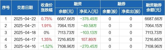 融资方面,当日融资买入87.89万元,融资偿还464.37万元,融资净偿还376.49万元,连续3日净偿还累计529.19万元。融券方面,融券卖出0股,融券偿还0股,融券余量0股,融券余额0元。融资融券余额合计6687.66万元。