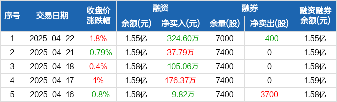 融资方面,当日融资买入139.94万元,融资偿还464.54万元,融资净偿还324.6万元。融券方面,融券卖出0股,融券偿还400股,融券余量7000股,融券余额3.57万元。融资融券余额合计1.55亿元。