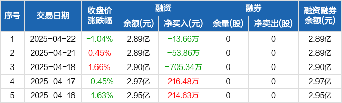 融资方面,当日融资买入361.41万元,融资偿还375.07万元,融资净偿还13.66万元,连续3日净偿还累计772.86万元。融券方面,融券卖出0股,融券偿还0股,融券余量0股,融券余额0元。融资融券余额合计2.89亿元。