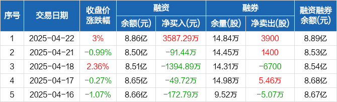 融资方面,当日融资买入7378.4万元,融资偿还3791.11万元,融资净买入3587.29万元。融券方面,融券卖出6500股,融券偿还2600股,融券余量14.84万股,融券余额229.28万元。融资融券余额合计8.89亿元。