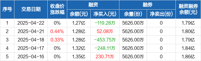 融资方面,当日融资买入829.32万元,融资偿还948.6万元,融资净偿还119.28万元。融券方面,融券卖出0份,融券偿还0份,融券余量5626万份,融券余额5175.92万元。融资融券余额合计1.79亿元。