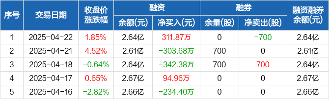 融资方面,当日融资买入1914.85万元,融资偿还1602.98万元,融资净买入311.87万元。融券方面,融券卖出0股,融券偿还700股,融券余量0股,融券余额0元。融资融券余额合计2.64亿元。