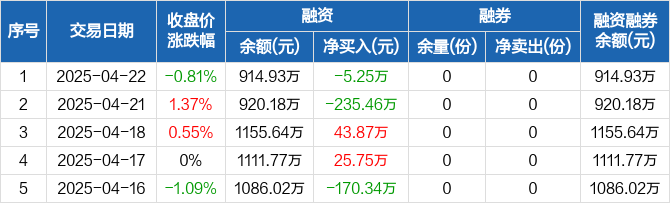 融资方面,当日融资买入83.51万元,融资偿还88.76万元,融资净偿还5.25万元。融券方面,融券卖出0份,融券偿还0份,融券余量0份,融券余额0元。融资融券余额合计914.93万元。