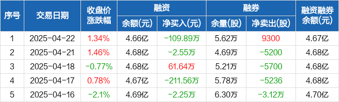 融资方面,当日融资买入1054.9万元,融资偿还1164.78万元,融资净偿还109.89万元。融券方面,融券卖出1.3万股,融券偿还3700股,融券余量5.62万股,融券余额59.35万元。融资融券余额合计4.67亿元。
