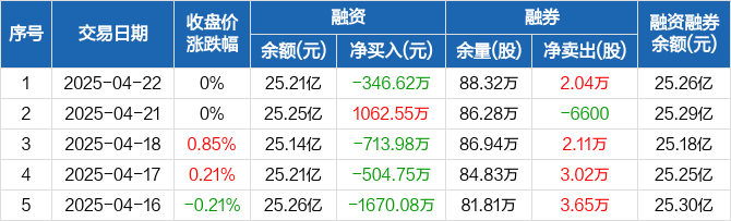 申万宏源融资融券信息显示,2025年4月22日融资净偿还346.62万元;融资余额25.21亿元,较前一日下降0.14%。