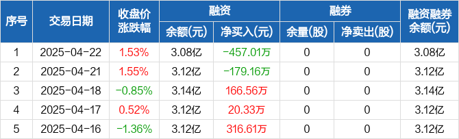 融资方面,当日融资买入751.76万元,融资偿还1208.77万元,融资净偿还457.01万元。融券方面,融券卖出0股,融券偿还0股,融券余量0股,融券余额0元。融资融券余额合计3.08亿元。