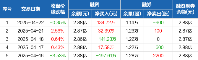 融资方面,当日融资买入910.44万元,融资偿还775.72万元,融资净买入134.72万元。融券方面,融券卖出0股,融券偿还900股,融券余量1.14万股,融券余额16.42万元。融资融券余额合计2.88亿元。