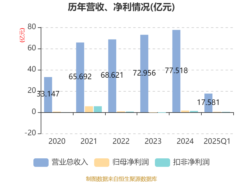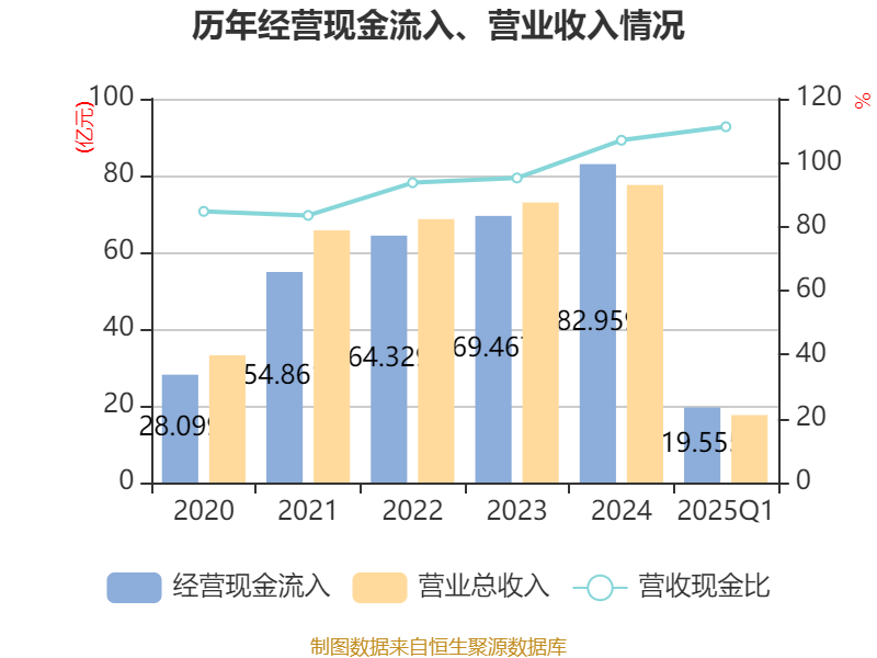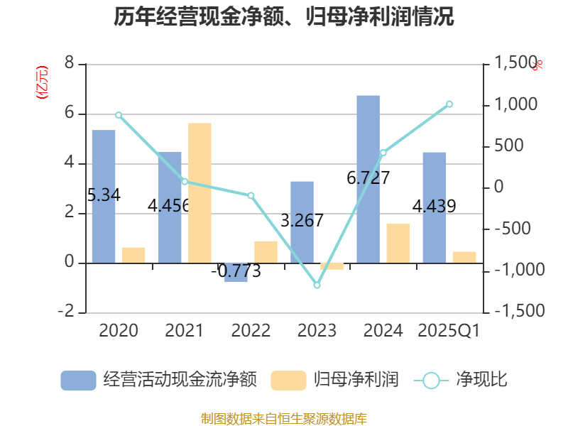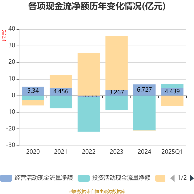 截至2025年一季度末,公司经营活动现金流净额为4.44亿元,同比增长35.32%;筹资活动现金流净额-6.3亿元,同比减少2.52亿元;投资活动现金流净额2.7亿元,上年同期为-2.23亿元。