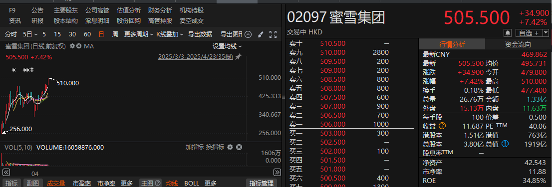 上证报中国证券网讯 4月23日,港股蜜雪集团持续拉升,盘中涨逾8%,股价最高至510港元,创历史新高。截至11时13分,蜜雪集团小幅回落,涨7.42%。