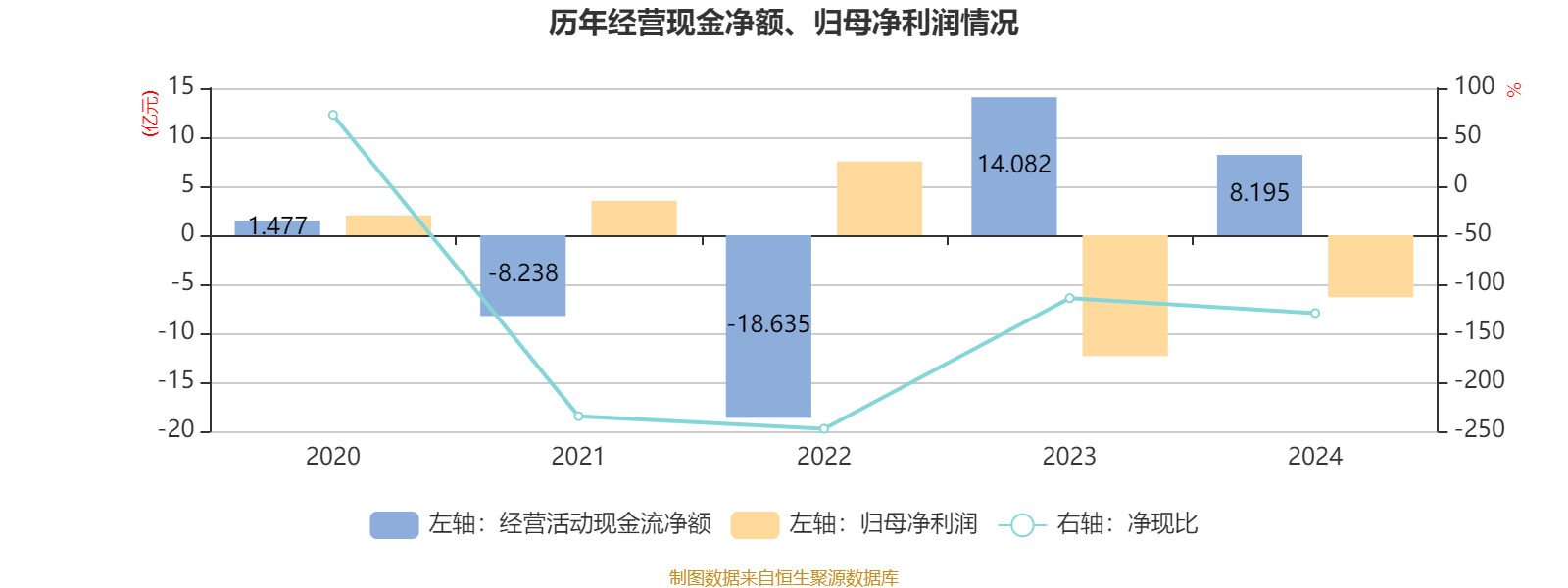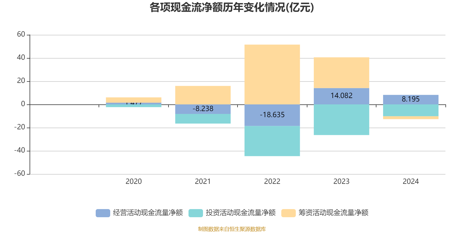 2024年,公司经营活动现金流净额为8.19亿元,同比下降41.81%;筹资活动现金流净额-2.5亿元,同比减少29亿元;投资活动现金流净额-10.21亿元,上年同期为-26.42亿元。